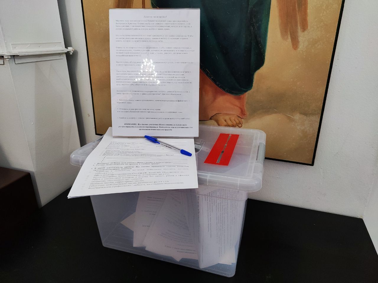 Специально для встречи были разработаны анкеты прихожанина, где каждый может оставить данные. Ответы на эти вопросы помогут вам рассказать о себе, о своих сильных сторонах, о тех возможностях, знаниях и умениях, которыми вы располагаете и готовы поделиться с приходской семьей.