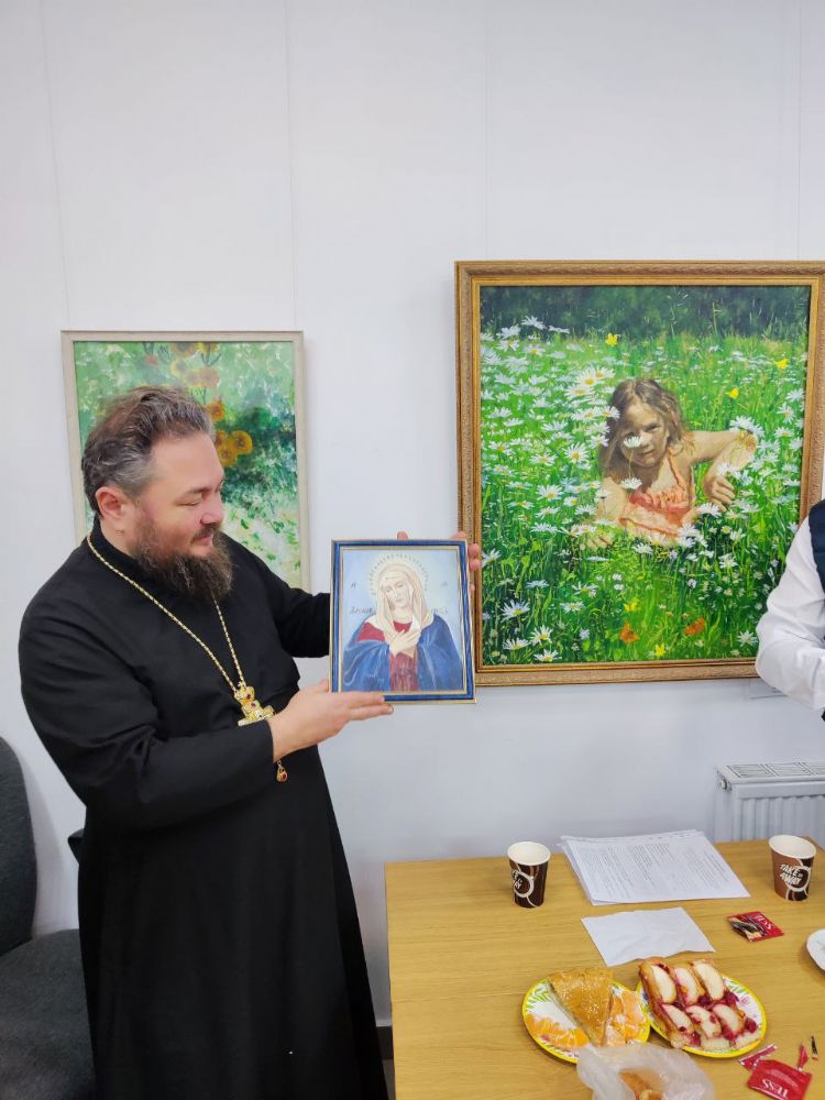 Так, одна из участниц встречи, преподнесла в дар приходу икону Божией Матери "Умиление", которую написала сама и тем самым явно продемонстрировала свой талант.